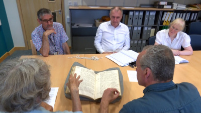 In conference around the Blofield land details at the Norfolk Record OfficeAs well as the various documents of the Paston Letters which contain references to the manor of Blofield, the Norfolk Record Office holds other documents. Of particular interest is the "book of Edward Paston Esq. for his manor of Bloffelde in the town of Bloffelde and in other towns and hamlets in Norfolk, made by John Debney of Norwich, public notary and by the tenants of the manor".