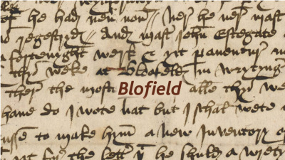 The word Blofield - above the modern font - in a Paston Letter of 1464Throughout the Paston Letters there are many mentions of people and places, including Blofield. Early on in the letters the parson of Blofield appears as a reluctant executor to Sir John Fastolf's will. Thomas Howes, that parson of Blofield, served as chaplain to Sir John Fastolf and thus occurs regularly in the Letters.