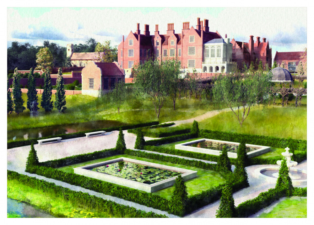 Oxnead Hall, church and gardens as we envisaged they looked at the time of the visit of King Charles II, in the 1670s.