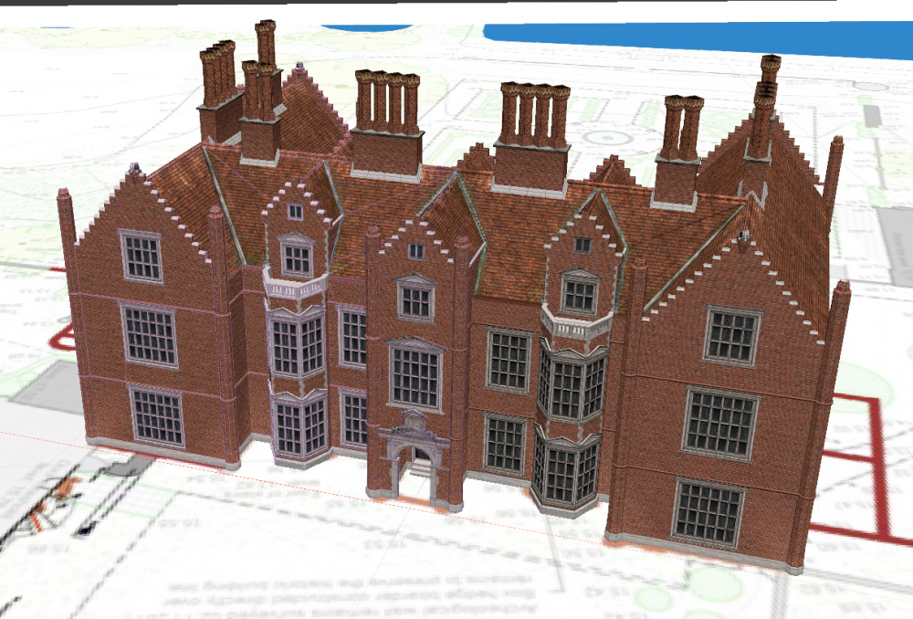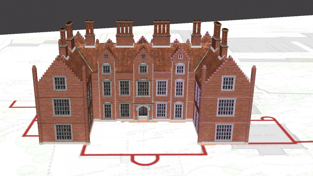 Key sources for the building of the 3D model of Oxnead Hall are the lithographs based on the drawing of John Repton. Repton did not actually see this view for himself as he became responsible for the hall after it had deteriorated somewhat, but he was able to speak to those who could describe it to him in detail. There is some change of detail between this straight-on view and another angled view but they are our best sources for understanding the hall at the final form of its final development.