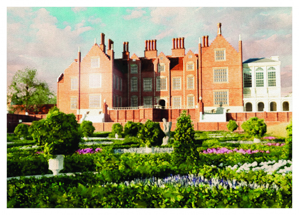 Oxnead Hall, church and gardens as we envisaged they looked at the time of the visit of King Charles II, in the 1670s.