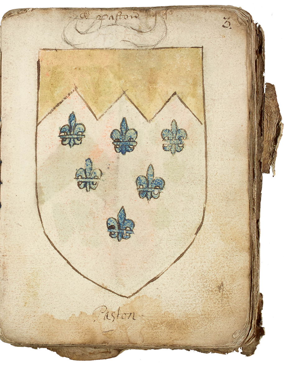 One of the fascinating documents among the Paston Letters is a book which has traditionally, though not necessarily correctly, been attributed to Friar Brackley. The first part consists of a series of coats of arms of friends, relatives and associates of the Paston family. On the latter pages are notes on French grammar, probably made by a young William Paston (1436-1496) while at the University of Cambridge. He may in fact have been the artist of the shields, and with the rarity and expense of paper, decided to use some pages for his notes.