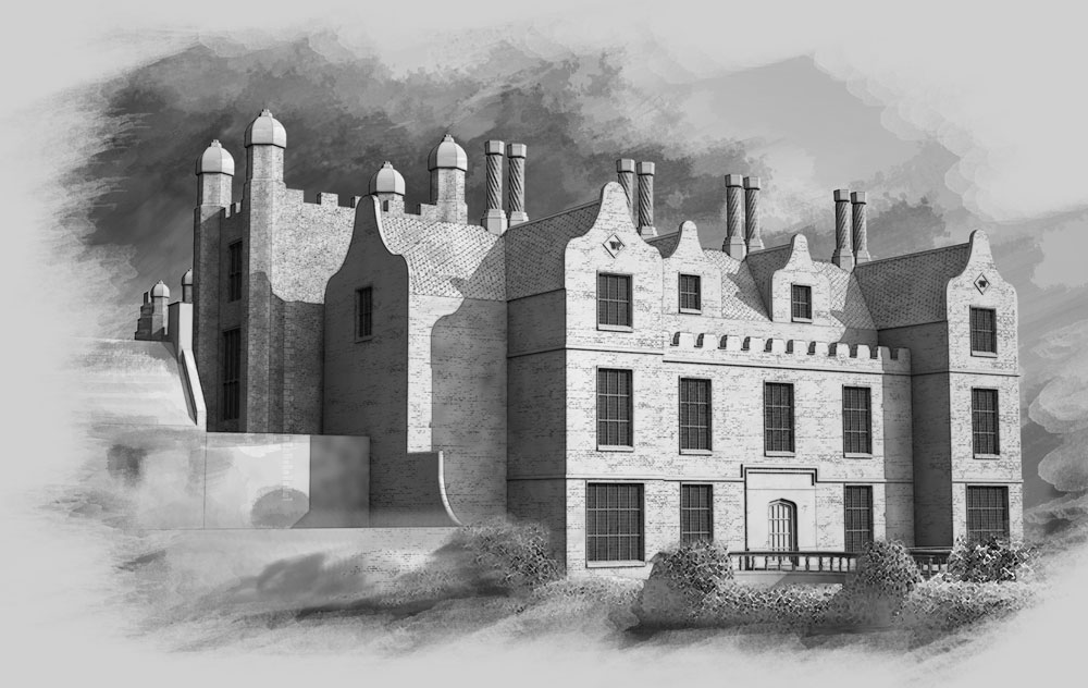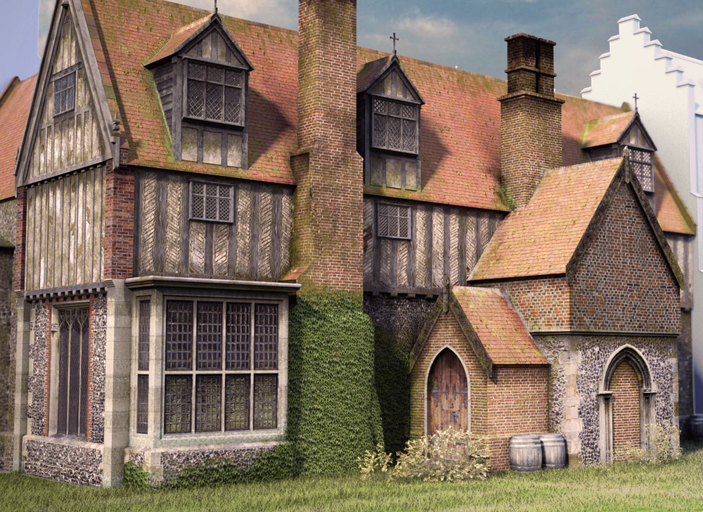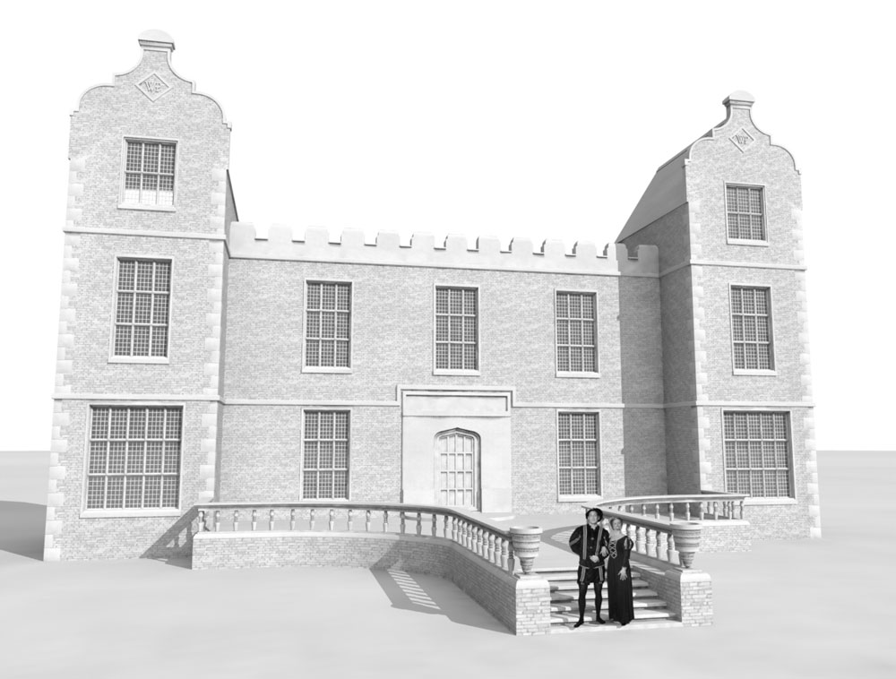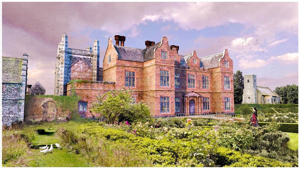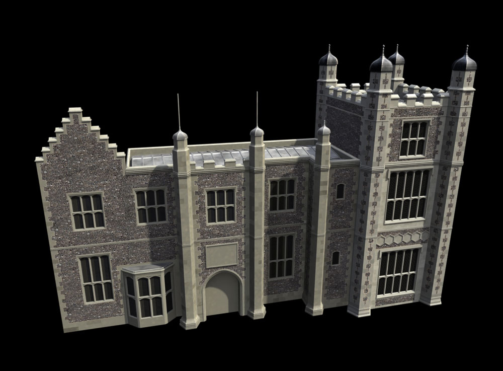 I've spent a lot of time revisiting what the original 15th century Hall may have looked like. There have been many iterations, but having seen the recent images of East Barsham Hall, I saw some similarities with the Boydell picture and currently favour the style below.