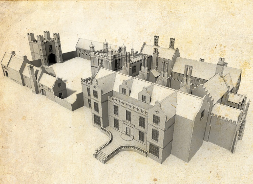 The Paston Hall model is complete and work moves to further models. There have been many iterations but we now feel that we have a reasonable representation of what Paston Hall looked like circa 1600. The still image we have used here pictures it as it might have been on a summer's day of that year, with the gardens in bloom. We will be adding some further images; an image which you can rotate and view in 3D on the sceen and video of the house overlaying the modern scene. As part of this this we have carried out full drone photography of the house.