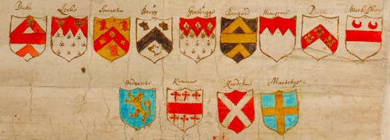 At the bottom of the document are two coats of arms. One has been divided eight times, the other has been quartered. This is called marshalling. You will notice that the coat of arms on the right contains two smaller coats of arms in the middle. If the woman's father has no sons, she becomes a heraldic heiress when he dies. She may then place her own family shield in the middle of her husband's shield, which is known as an escutcheon of pretence.
